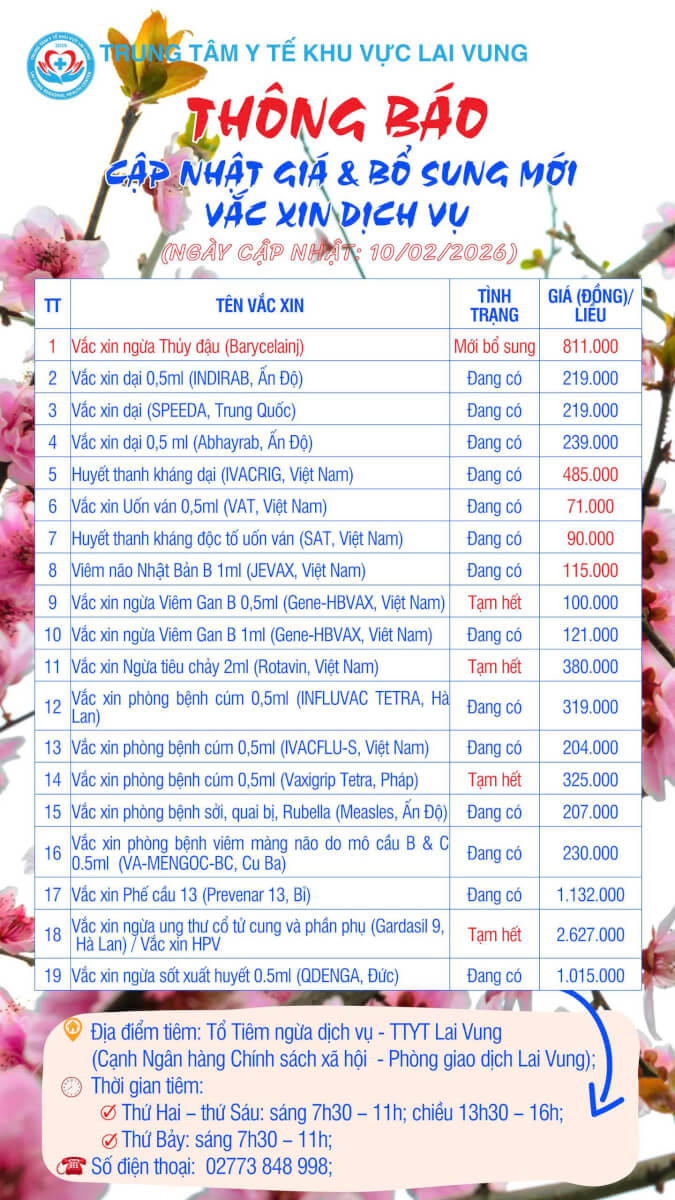 Trung tâm Y tế khu vực Lai Vung thông báo cập nhật giá & bổ sung mới vắc xin dịch vụ của Trung tâm để Quý Bà con thuận tiện theo dõi và sử dụng khi có nhu cầu (Ngày cập nhật 10/02/2026):